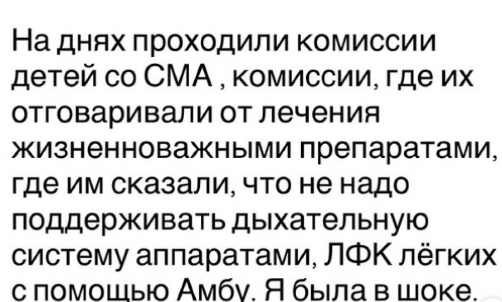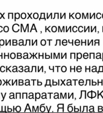 Сейчас по городам Казахстана ездит комиссия Минздрава РК, в которой нет ни одного специалиста, хорошо знающего особенности диагноза СМА, но которая раздает рекомендации прямо противоположные назначениям наших экспертов, годами обучавшихся и имевших хорошие результаты при ведении наших СМАйликов.