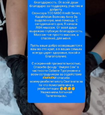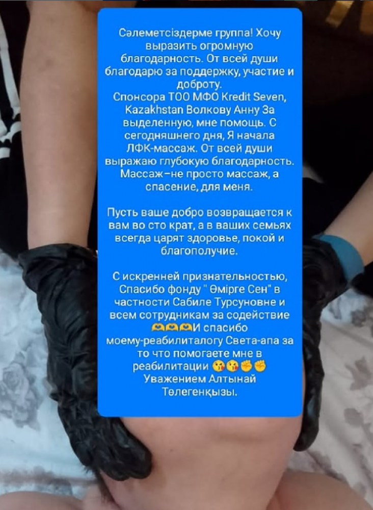 «Сәлеметсіздерме! Хочу выразить огромную благодарность. От всей души благодарю за поддержку, участие и доброту Спонсора ТОО МФО Kredit Seven, Kazakhstan Волкову Анну За выделенную, мне помощь. С сегодняшнего дня, Я начала ЛФК-массаж. От всей души выражаю глубокую благодарность.